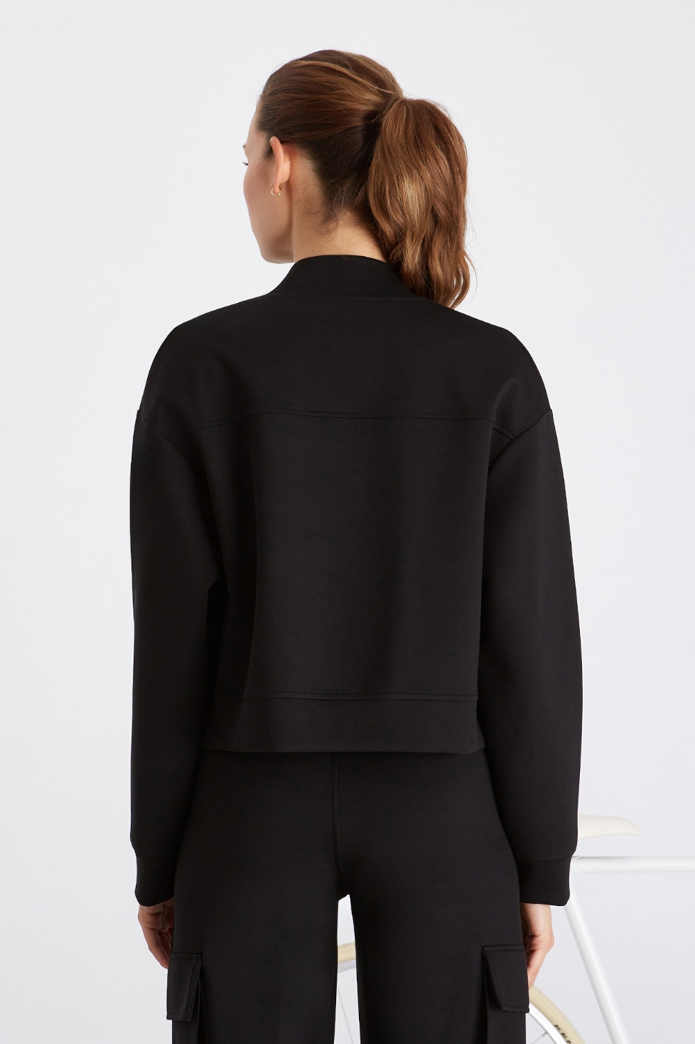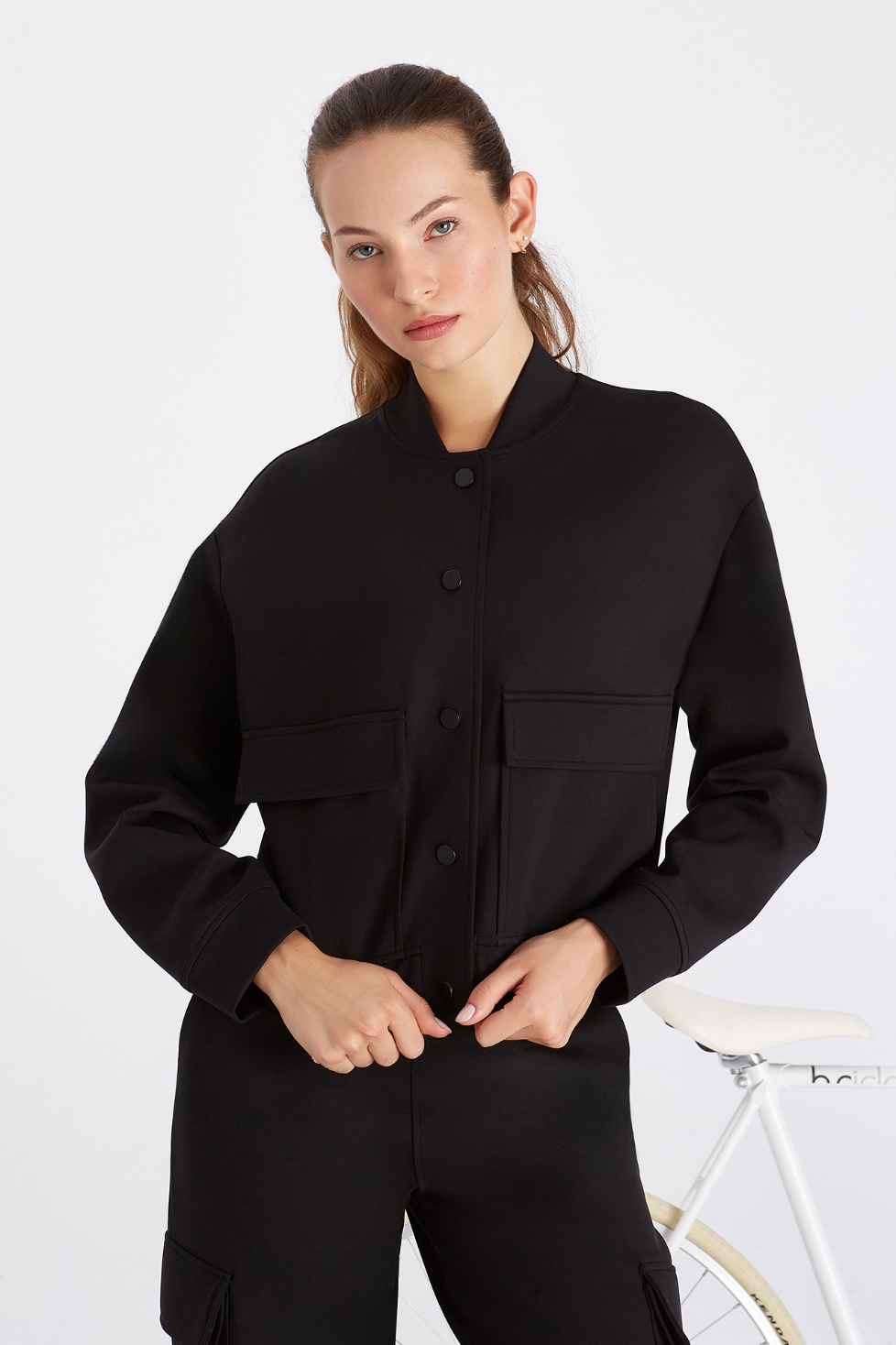 • Formunu koruyan ve nefes alan kumaştan üretilen Patricia bomber ceket, rahat kesimi ve ön bedendeki kargo cepleriyle modern bir stil sunar. Bomber yaka detayıyla klasik duruşunu korurken, günlük konforu da yanında taşır.